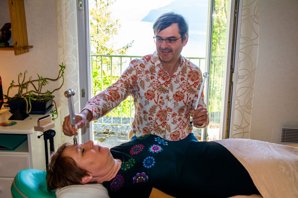 J’utilise des diapasons spéciaux, aux sons doux et subtils, agissant simultanément sur le corps et sur l’aura